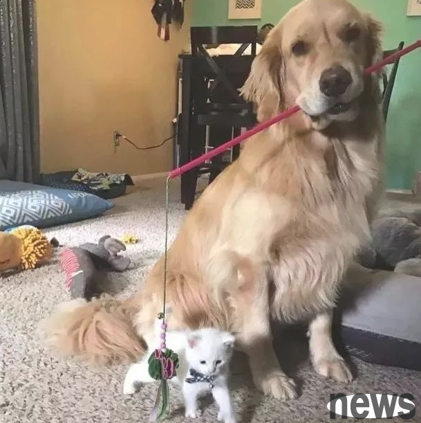 Mojito, the golden retriever, is the guardian of the little cat Skywalker.