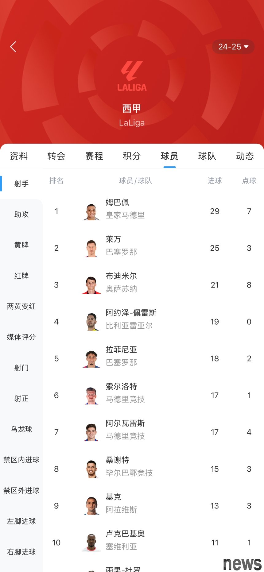 Mbappe ranked first with 29 goals, leading Lewandowski 4 goals