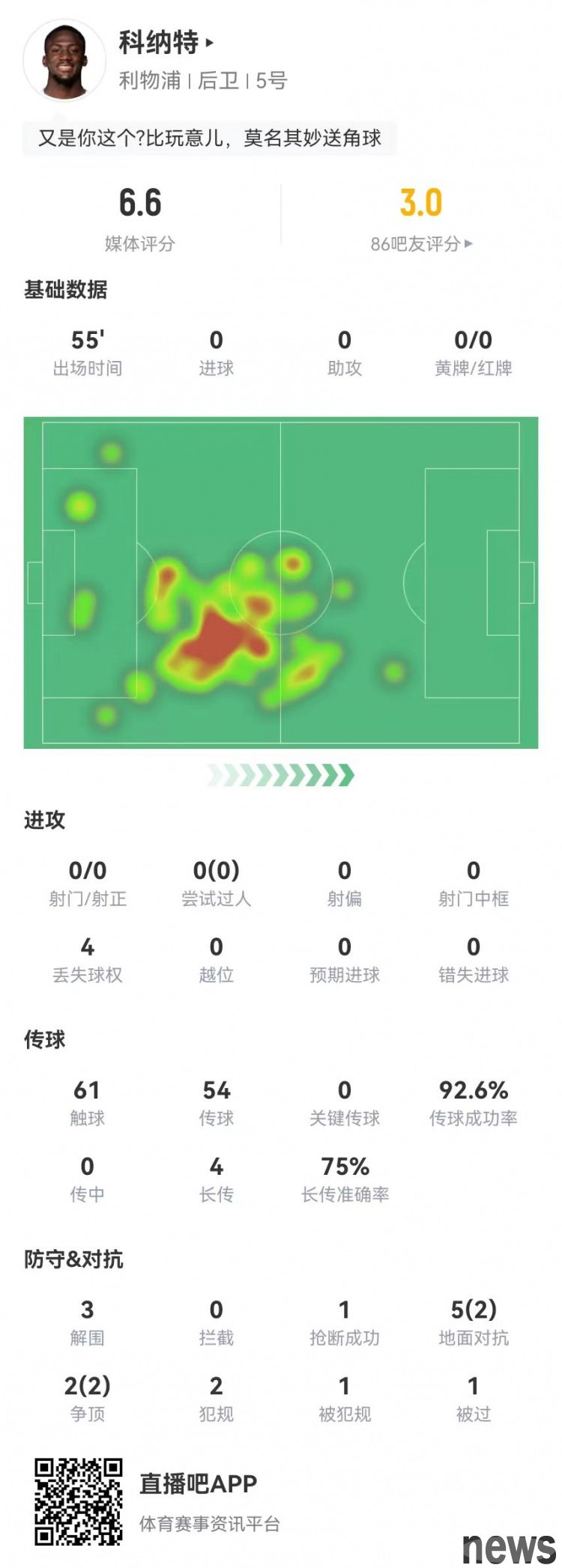 Continue? After being replaced in the 55th minute, Konate scored 6.6 points with 3 successful long passes, 3 clearances and 2 fouls.