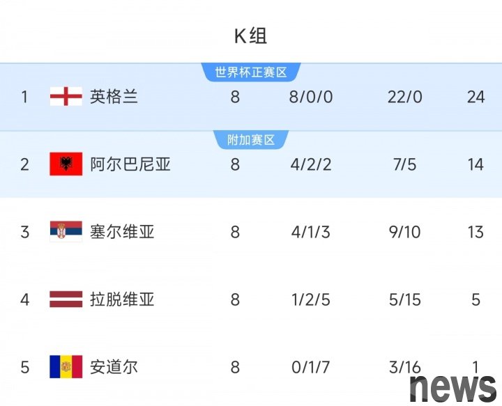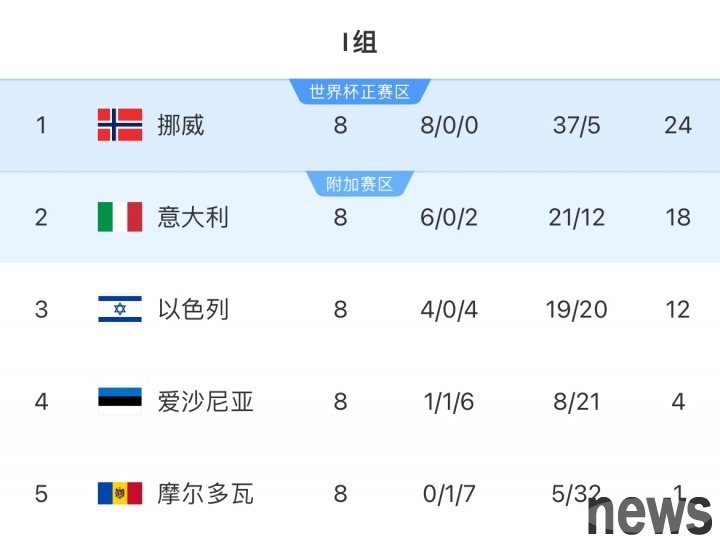 Both Norway and England advanced with complete victories. Among them, the former scored 37 goals in 8 games and conceded 5 goals, including classic battles such as a double defeat of Italy and 11-1 Moldova; the latter scored 22 goals and conceded 0 goals in 8 games, maintaining a complete victory without conceding a goal.