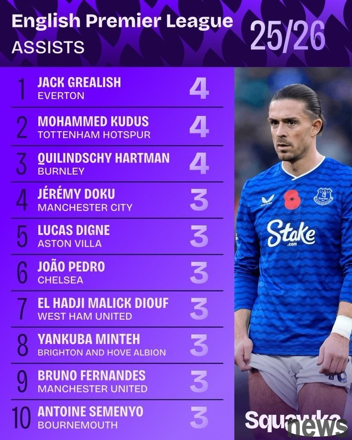 The Premier League has gone on for 11 rounds. Squakwa also counted the assists in the Premier League this season. Grealish and three others tied for the top spot.