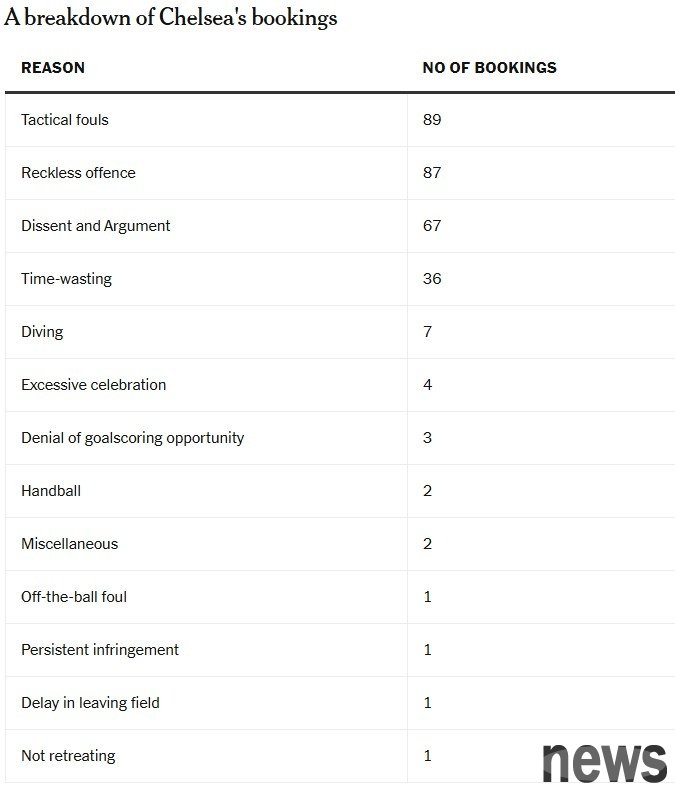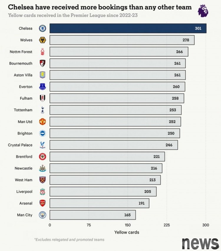 Since the 2022-23 season, Chelsea has received 301 yellow cards in the Premier League, far more than any other team