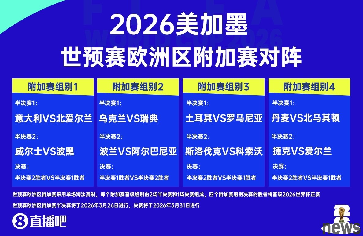 The European playoff matches of the World Cup preliminaries are announced. Italy faces Northern Ireland and Ukraine faces Sweden.